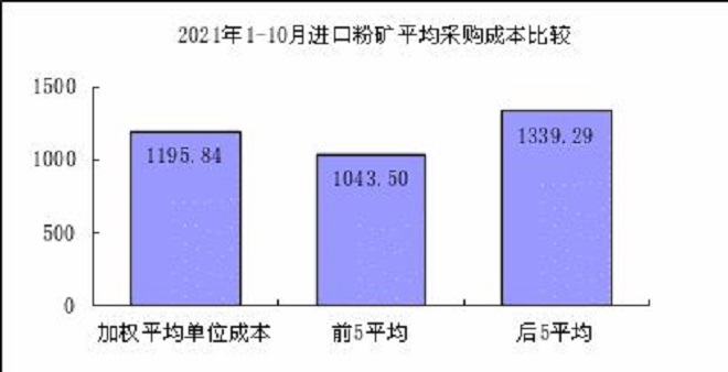 1-10月對標企業進口粉礦折算成62%品位的平均采購成本為1195.84元/噸,成本最低的前5家企業的加權平均采購成本為1043.50元/噸,比對標企業平均采購成本低152.34元/噸,低于平均采購成本12.74%;而采購成本最高的5家企業加權平均采購成本為1339.29元/噸,比對標企業平均采購成本高143.45元/噸,高于平均采購成本12.00%。