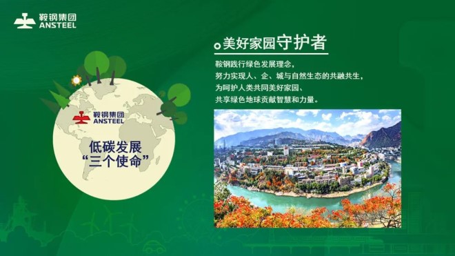 低碳發展“三個使命”是:綠色鋼鐵先行者、低碳技術引領者、美好家園守護者。