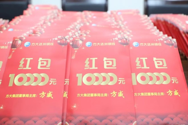 壬寅年春節前夕,在遼寧方大集團董事局主席方威建議下,方大達州鋼鐵為每名員工發放10000元春節紅包。