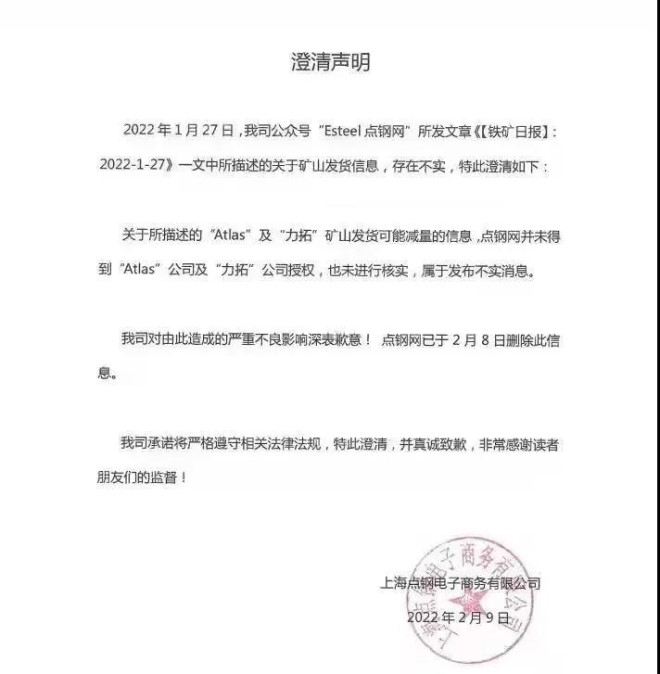 無巧不成書。就在2月9日上午,點鋼網(Esteel)發布了一個澄清聲明(如下):