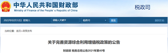 為推動資源綜合利用行業持續健康發展,財政部、國家稅務總局印發《關于完善資源綜合利用增值稅政策的公告》(財政部 稅務總局公告2021年第40號)(以下簡稱“《公告》”),明確自2022年3月1日起執行新的資源綜合利用增值稅政策。