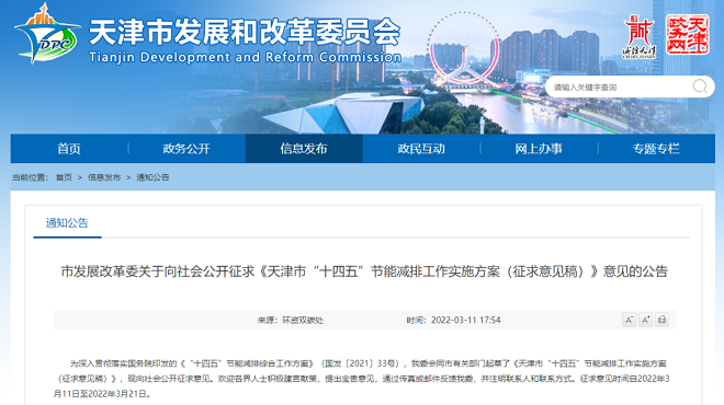 3月11日,天津市發展改革委官網發布關于向社會公開征求《天津市“十四五”節能減排工作實施方案(征求意見稿)》意見的公告(以下簡稱公告)。