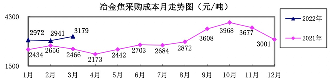 2022年3月,煤焦和鐵礦石、廢鋼采購成本全面上升。
