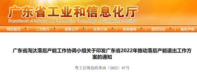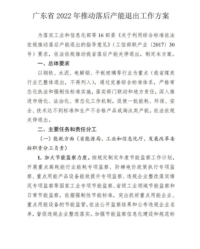 近日,廣東省工信廳網站發布了廣東省淘汰落后產能工作協調小組關于印發廣東省2022年推動落后產能退出工作方案的通知?!稄V東省2022年推動落后產能退出工作方案》(以下簡稱《方案》)提出,以鋼鐵、水泥、電解鋁、平板玻璃等行業為重點,通過完善綜合標準體系,嚴格常態化執法和強制性標準實施,落實部門聯動和地方責任,深入推進市場化、法治化、常態化工作機制,促使一批能耗、環保、安全、技術達不到標準和生產不合格產品或淘汰類產能,依法依規關停退出。