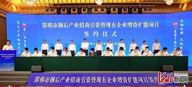 6月11日上午,河北省邯鄲市舉辦鋼后產業(yè)招商引資暨現有企業(yè)增資擴能項目簽約儀式,來自湖南、江蘇等地的7家企業(yè)與該市10家鋼鐵骨干企業(yè)及配套關聯企業(yè)共簽約項目17個,總投資316.6億元,將助力邯鄲產業(yè)轉型升級。