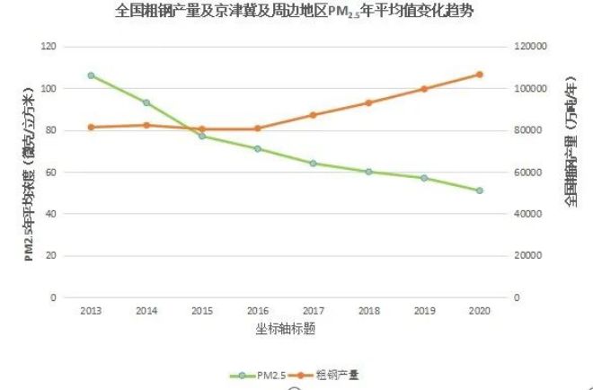 圖1 全國(guó)粗鋼產(chǎn)量及京津冀周邊地區(qū)PM2.5年平均值變化趨勢(shì)