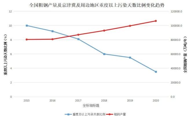 圖2 全國(guó)粗鋼產(chǎn)量及京津冀周邊地區(qū)重度以上污染天數(shù)比例變化趨勢(shì)
