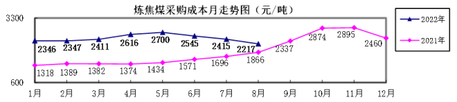 對標企業煉焦煤8月份加權平均折算成干基的采購成本為2217.23元/噸,環比下降197.43元/噸,降幅為8.18%。1-8月累計平均折算成干基的采購成本為2445.30元/噸,同比升高940.83元/噸,升幅為62.54%。