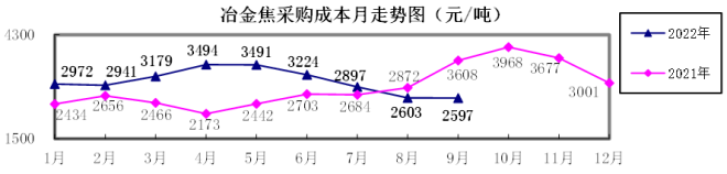 冶金焦9月份加權(quán)平均折算成干基的采購(gòu)成本2596.84元/噸,環(huán)比下降6.51元/噸,降幅為0.25%。1—9月累計(jì)平均折算成干基的采購(gòu)成本為3038.26元/噸,同比升高372.54元/噸,升幅為13.98%。