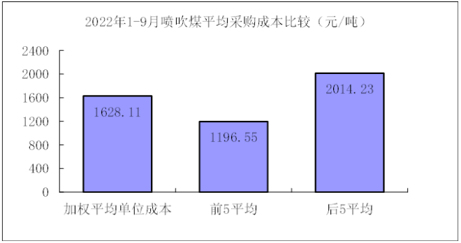 1—9月對(duì)標(biāo)企業(yè)噴吹煤平均采購(gòu)成本最低的前5家企業(yè)折算成干基的加權(quán)平均采購(gòu)成本為1196.55元/噸,比對(duì)標(biāo)企業(yè)平均采購(gòu)成本低431.56元/噸,低于平均采購(gòu)成本26.51%;而采購(gòu)成本最高的5家企業(yè)的加權(quán)平均采購(gòu)成本為2014.23元/噸,比對(duì)標(biāo)企業(yè)平均采購(gòu)成本高386.12元/噸,高于平均采購(gòu)成本23.72%。
