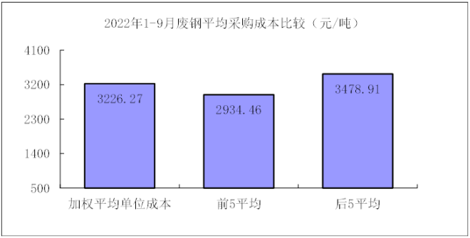 1—9月對(duì)標(biāo)企業(yè)廢鋼平均采購(gòu)成本最低的前5家企業(yè)的加權(quán)平均采購(gòu)成本為2934.46元/噸,比對(duì)標(biāo)企業(yè)平均采購(gòu)成本低291.81元/噸,低于平均采購(gòu)成本9.04%;而采購(gòu)成本最高的5家企業(yè)加權(quán)平均采購(gòu)成本為3478.91元/噸,比對(duì)標(biāo)企業(yè)平均采購(gòu)成本高252.64元/噸,高于平均采購(gòu)成本7.83%。