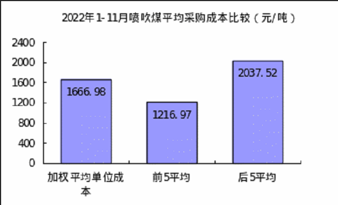 噴吹煤11月份加權平均折算成干基的采購成本為1862.59元/噸,環比升高75.89元/噸,升幅為4.25%。1—11月累計平均折算成干基的采購成本為1666.98元/噸,同比升高348.89元/噸,升幅為26.47%。