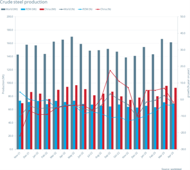 2023年4月全球63個(gè)納入世界鋼鐵協(xié)會(huì)統(tǒng)計(jì)的國(guó)家和地區(qū)的粗鋼產(chǎn)量為1.614億噸,同比下降2.4%。