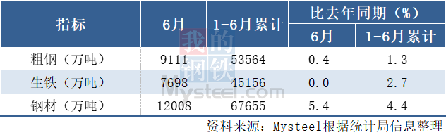 6月,中國粗鋼產(chǎn)量9111萬噸,同比增長0.4%;生鐵產(chǎn)量7698萬噸,同比持平;鋼材產(chǎn)量12008萬噸,同比增長5.4%。