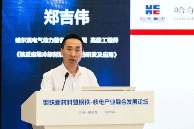 哈爾濱電氣動力裝備有限公司高級工程師鄭吉偉做題為《核反應堆冷卻劑泵用鋼材的研發及應用》的學術報告