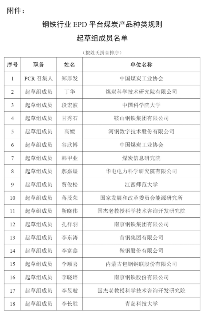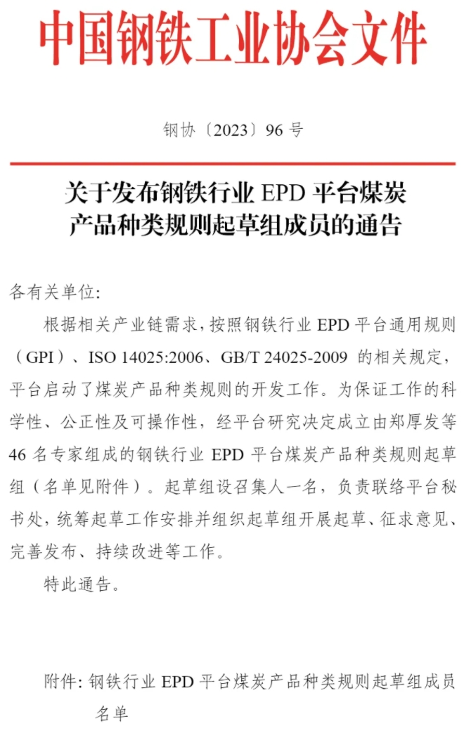 關(guān)于發(fā)布鋼鐵行業(yè)EPD平臺煤炭產(chǎn)品種類規(guī)則起草組成員的通告