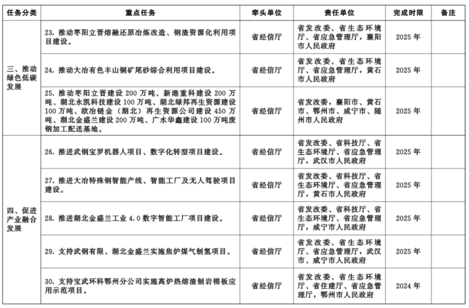 13.實施鋼鐵行業超低排放改造。2023年底前,推進武漢、襄陽、黃石、荊州、鄂州、咸寧等地鋼鐵企業完成超低排放改造,2025年底前全省鋼鐵企業完成超低排放改造。