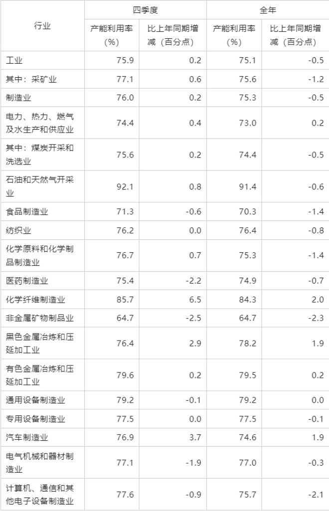 2023年四季度,全國規(guī)模以上工業(yè)產(chǎn)能利用率為75.9%,比上年同期上升0.2個百分點,比上季度上升0.3個百分點。2023年全國工業(yè)產(chǎn)能利用率為75.1%,比上年下降0.5個百分點。