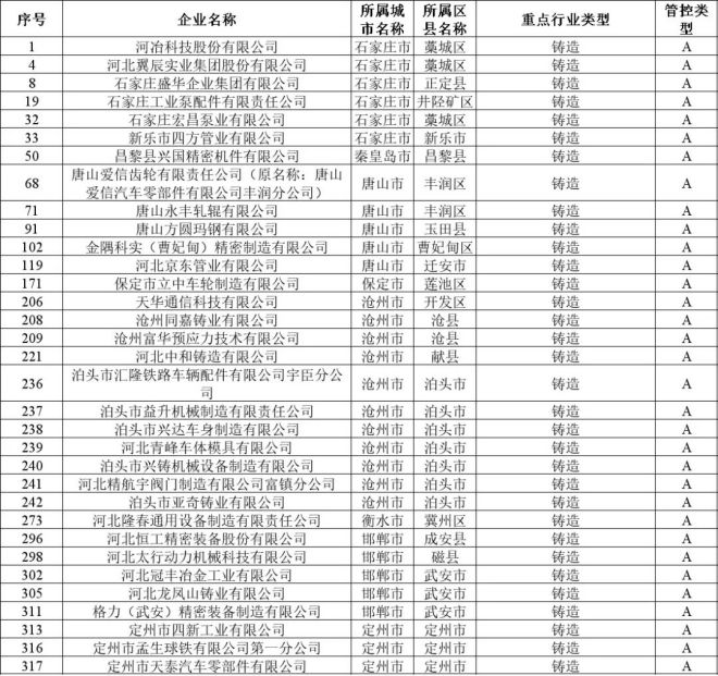 河北省重點行業環保績效B級企業清單(鑄造)