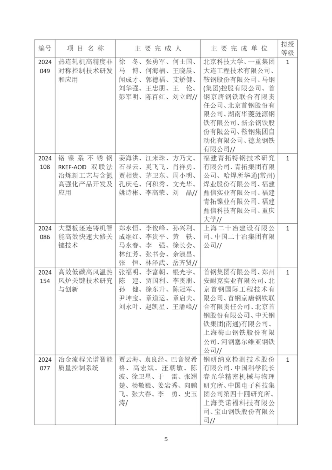 2024年中國鋼鐵工業(yè)協(xié)會、中國金屬學(xué)會冶金科學(xué)技術(shù)獎(簡稱冶金科學(xué)技術(shù)獎)評審委員會評審已經(jīng)結(jié)束,擬授獎110項(xiàng),其中:特等獎3項(xiàng),一等獎21項(xiàng),二等獎29項(xiàng),三等獎57項(xiàng)。根據(jù)評審程序,現(xiàn)將評審委員會推薦獲獎項(xiàng)目向社會公告。