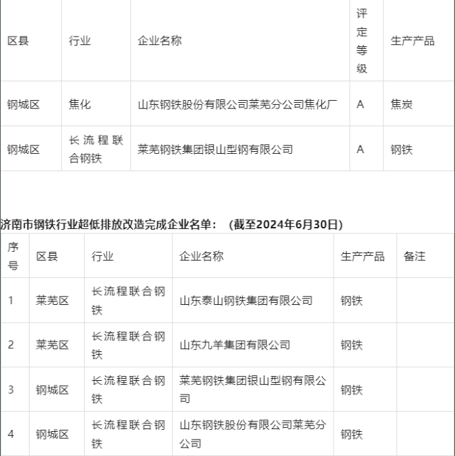 濟南市重污染天氣環保績效A級鋼鐵企業名單:(截至2024年6月30日)
