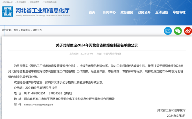 9月3日,河北省工業和信息化廳發布了《關于對擬確定2024年河北省省級綠色制造名單的公示》(點擊公示可觀看全文)。