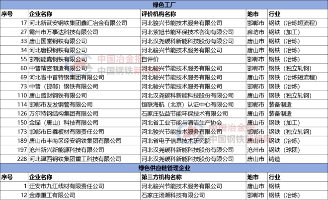 該名單公布了綠色工廠238家,綠色園區9家,綠色供應鏈管理企業13家。其中,共有18家鋼鐵相關企業上榜,金鼎、九江上榜河北省綠色供應鏈管理企業公示名單。