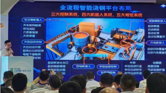 論壇上,來自鞍鋼、本鋼、沙鋼、酒鋼、南鋼、太鋼等知名鋼鐵企業的代表,以及智能制造技術領域的專家,紛紛發表了精彩的演講。其中,湖南省鐳目科技有限公司(下文簡稱鐳目公司)技術代表付軍的演講《連鑄平臺全流程智能化和無人化》引起了廣泛的關注。