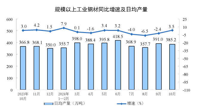 2024年10月份,我國(guó)鋼材產(chǎn)量11941萬(wàn)噸,同比增長(zhǎng)3.5%;1-10月份,我國(guó)鋼材產(chǎn)量116484萬(wàn)噸,同比增長(zhǎng)0.5%。