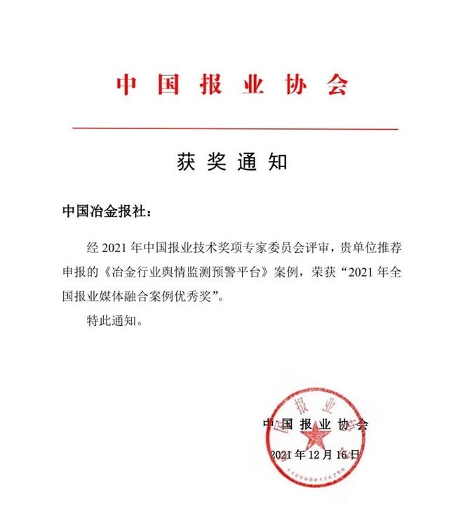 截至目前,平臺先后榮獲2021年全國報業媒體融合案例優秀獎、首屆中國行業媒體融合發展案例征評(行業服務類)提名案例、2021—2022年度全國媒體融合技術應用“優秀”案例等獎項。