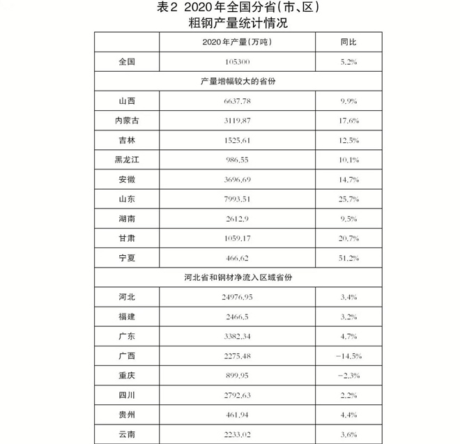 從2020年全國(guó)分省(直轄市、自治區(qū))粗鋼產(chǎn)量統(tǒng)計(jì)來(lái)看,大量存在鋼材凈流出區(qū)域的省(直轄市、自治區(qū))粗鋼產(chǎn)量同比大幅增長(zhǎng)的現(xiàn)象,反映出國(guó)內(nèi)鋼材市場(chǎng)在生產(chǎn)和消費(fèi)上的不匹配。而這些省(直轄市、自治區(qū))應(yīng)該成為控制粗鋼產(chǎn)量的重點(diǎn)限制區(qū)域。(見(jiàn)表2)
