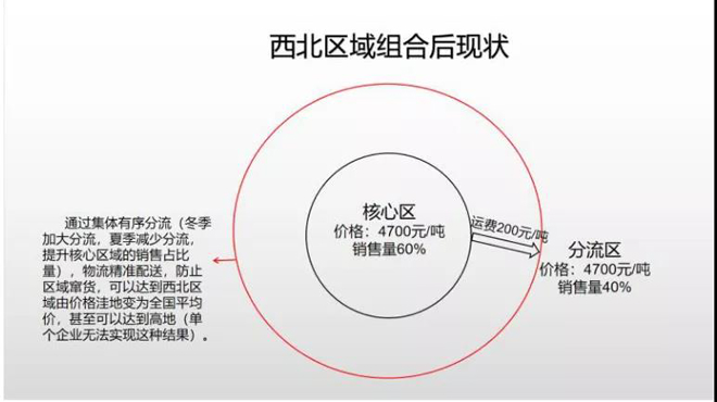 他介紹,鋼鐵企業在核心市場區銷量占60%,分流區占40%,將核心區的60%銷量通過合作形成合理的、不高于分流區的價格,形成相對良性健康的生態圈(如圖所示)。