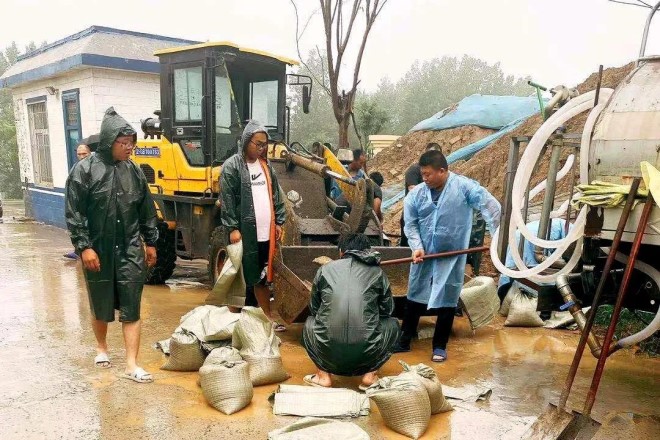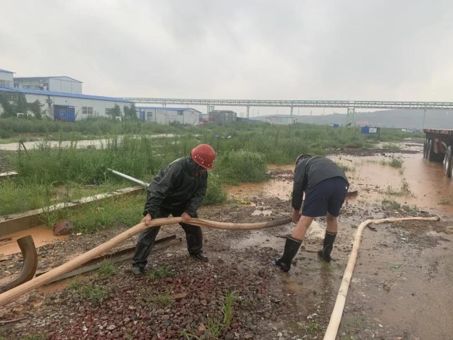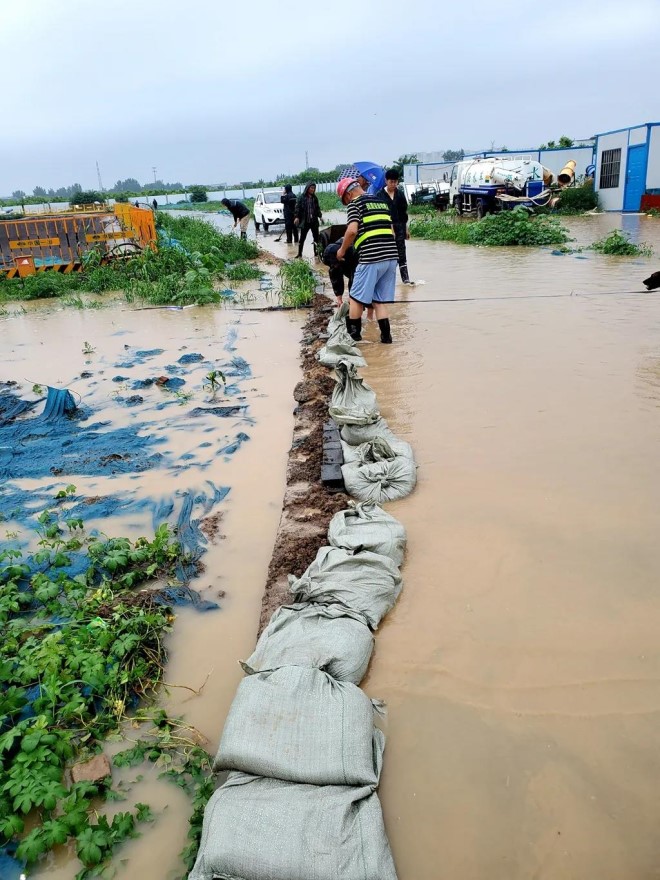 中冶天工迅速成立河南片區防汛應急現場指揮部,第一時間對河南片區項目防汛抗災工作進行安排部署,并建立防汛應急工作群,以便于實時跟蹤對接現場情況,全力確保項目人員及周邊群眾的生命安全。河南洛陽孟津項目部緊急采購了止水沙袋、排水泵、排水帶、雨衣、雨鞋等應急物資,發出請戰書,隨時做好應急救援準備;周口片區各項目部緊急成立24小時在崗值守搶險救援小隊,從嚴全面持續開展安全隱患排查和處置工作,以飽滿的精神、昂揚的斗志備戰各項工作,共同守護人民群眾生命財產安全;河南鶴壁碧桂園項目第一時間成立黨員突擊隊,面對鶴壁浚縣及周邊相鄰村鎮衛河鶴壁新鎮段決堤,河水涌入附近村莊,項目突擊隊加緊時間加工制作鋼筋籠,圍堵堤口,最大程度阻止泄洪,保障當地居民的生命財產安全。