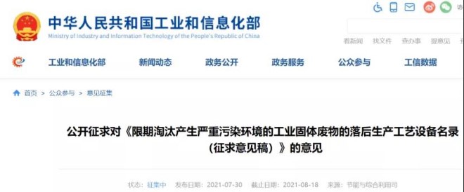 7月30日,工業(yè)和信息化部網(wǎng)站發(fā)布意見征集公告。公告顯示,為貫徹落實(shí)《固體廢物污染環(huán)境防治法》,加快淘汰產(chǎn)生嚴(yán)重污染環(huán)境的工業(yè)固體廢物的落后生產(chǎn)工藝、設(shè)備,持續(xù)提高工業(yè)綠色發(fā)展水平,工業(yè)和信息化部節(jié)能與綜合利用司研究起草了《限期淘汰產(chǎn)生嚴(yán)重污染環(huán)境的工業(yè)固體廢物的落后生產(chǎn)工藝設(shè)備名錄(征求意見稿)》。現(xiàn)將征求意見稿向社會(huì)公開征求意見,如有意見或建議,請(qǐng)于2021年8月18日前反饋工業(yè)和信息化部節(jié)能與綜合利用司。