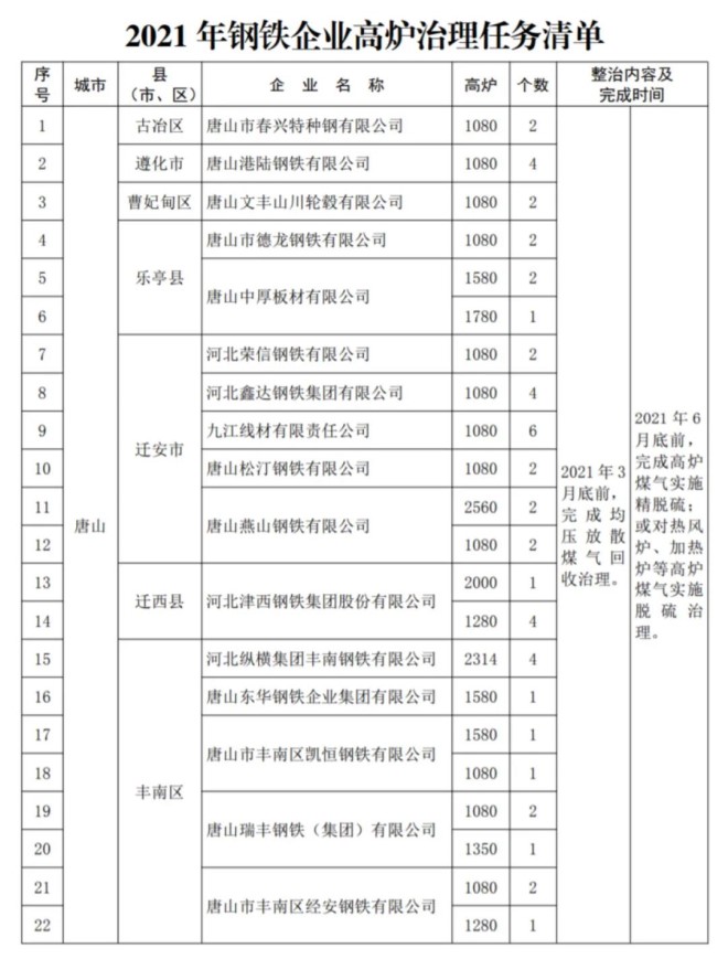 河北省2021年大氣污染治理鋼鐵受限清單出爐