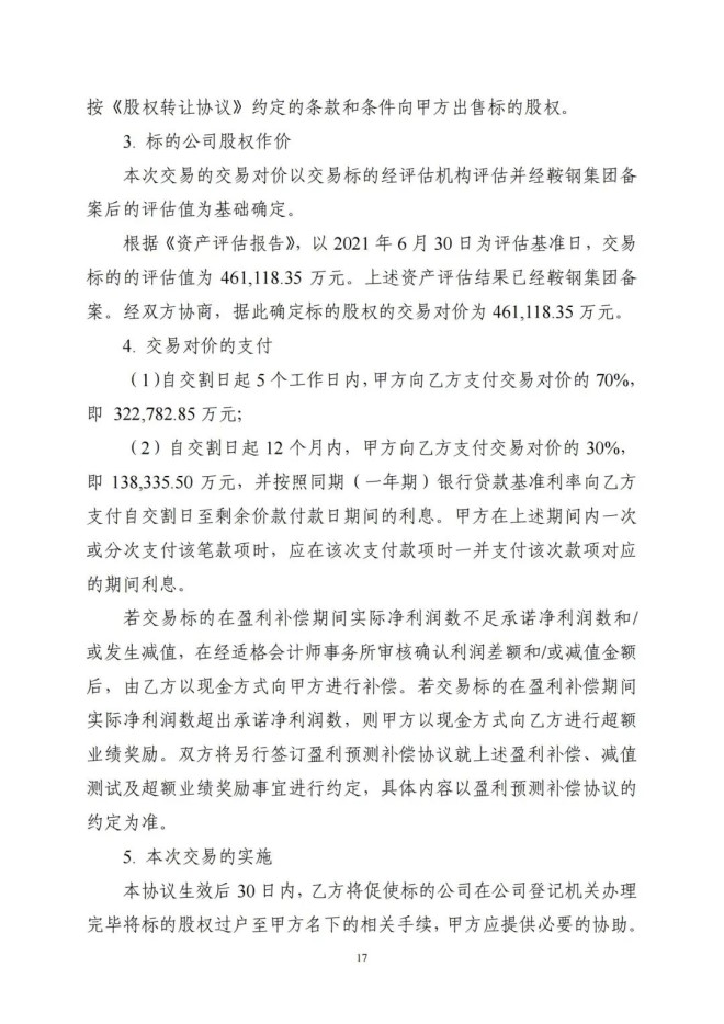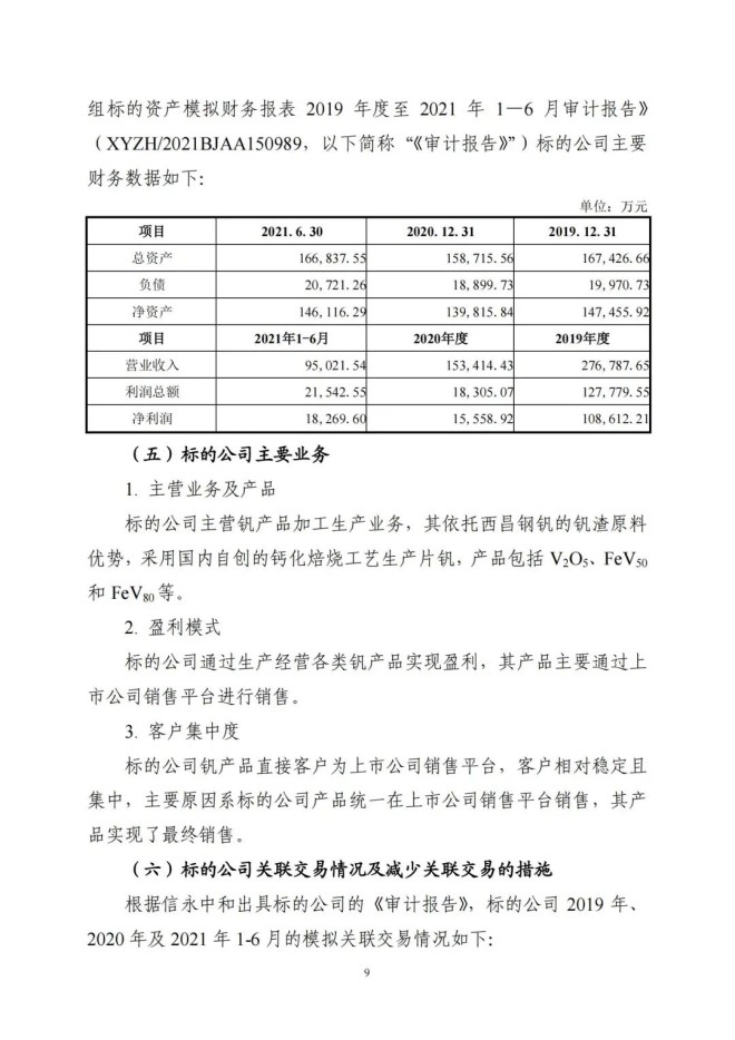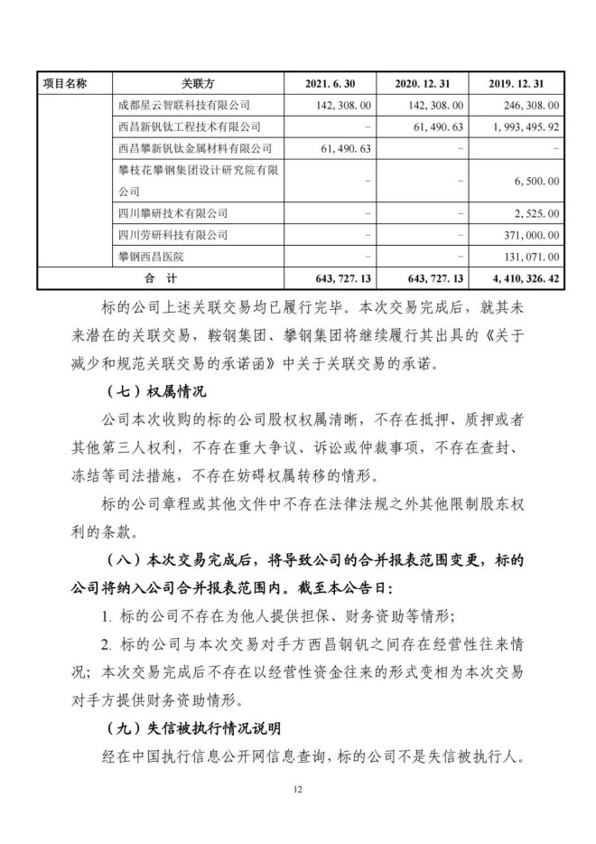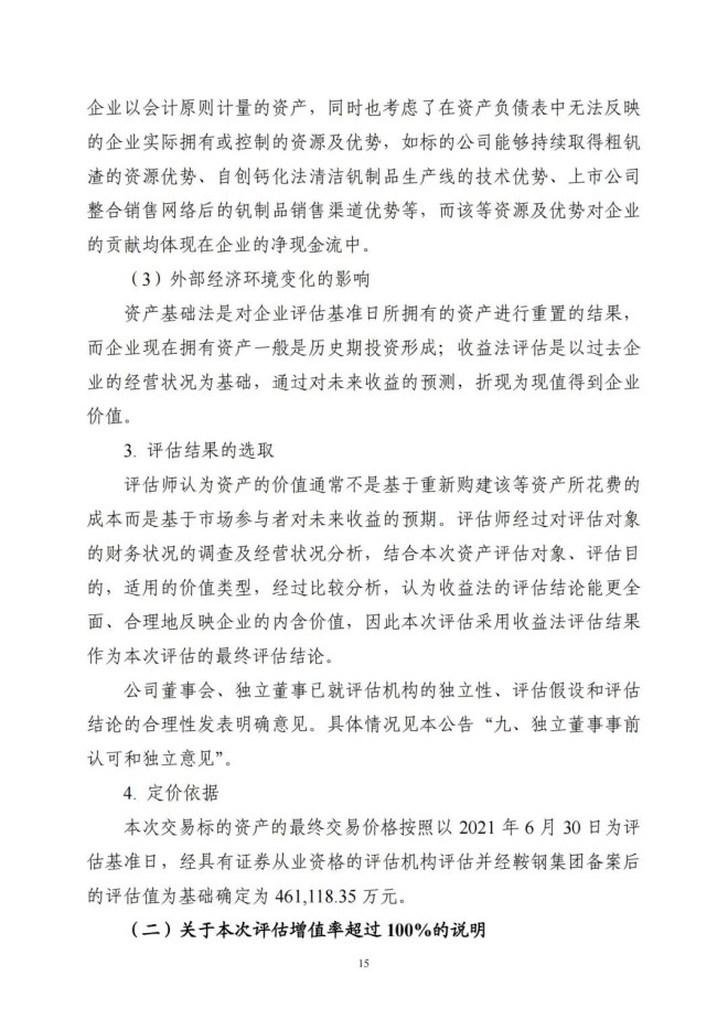 本次交易參考北京天健興業資產評估有限公司出具的《攀鋼集團釩鈦資源股份有限公司擬現金收購攀鋼集團西昌鋼釩有限公司持有的 100%攀鋼集團西昌釩制品科技有限公司股權項目資產評估報告》作為定價依據,經鞍鋼集團有限公司備案,并經交易雙方協商確定標的公司股權轉讓價款為 461118.35 萬元。