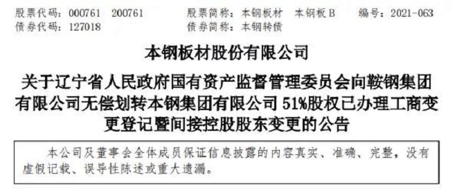 本鋼板材(000761)10月12日晚公告稱,公司近日收到本鋼集團(tuán)通知,遼寧省國(guó)資委向鞍鋼集團(tuán)無(wú)償劃轉(zhuǎn)本鋼集團(tuán)51%股權(quán)事項(xiàng)已通過(guò)中國(guó)反壟斷審查及必要的中國(guó)境外反壟斷審查,并于10月12日辦理股東工商變更登記手續(xù)。