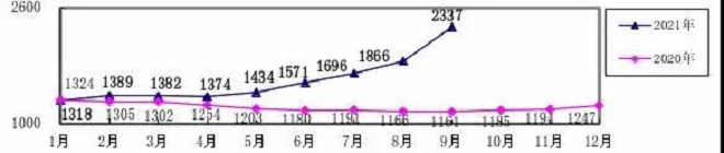 對標企業煉焦煤9月份加權平均折算成干基的采購成本為2337.12元/噸,環比升高471.24元/噸,升幅為25.26%。1-9月累計平均折算成干基的采購成本為1597.88元/噸,同比升高369.96元/噸,升幅為30.13%。