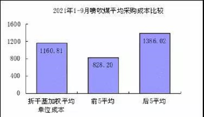 噴吹煤9月份加權平均折算成干基的采購成本為1560.91元/噸,環比升高207.55元/噸,升幅為15.34%。1-9月累計平均折算成干基的采購成本為1160.81元/噸,同比升高365.27元/噸,升幅為45.92%。