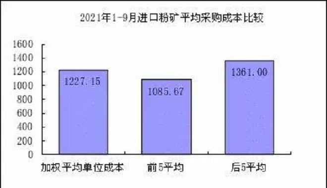 1-9月對標企業進口粉礦折算成62%品位的平均采購成本為1227.15元/噸,成本最低的前5家企業的加權平均采購成本為1085.67元/噸,比對標企業平均采購成本低141.48元/噸,低于平均采購成本11.53%;而采購成本最高的5家企業加權平均采購成本為1361.00元/噸,比對標企業平均采購成本高133.85元/噸,高于平均采購成本10.91%。