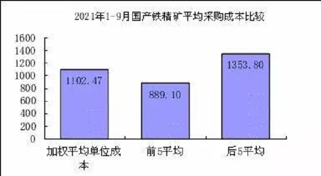 1-9月對標企業國產鐵精礦折算成62%品位的平均采購成本為1102.47元/噸,成本最低的前5家企業的加權平均采購成本為889.10元/噸,比對標企業平均采購成本低213.36元/噸,低于平均采購成本19.35%;而采購成本最高的5家企業的加權平均采購成本為1353.80元/噸,比對標企業平均采購成本高251.34元/噸,高于平均采購成本22.80%。