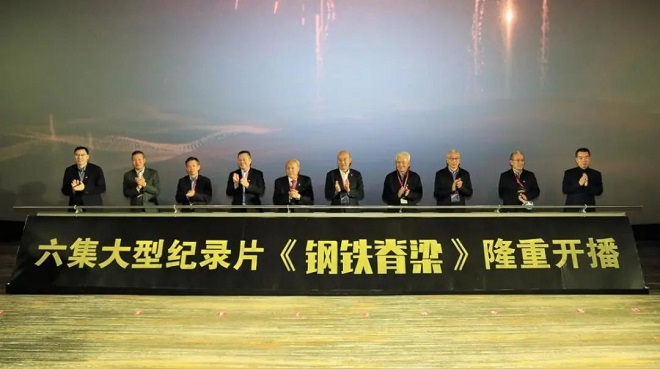 會議在全體起立奏唱國歌中拉開序幕,吳溪淳、何文波、趙喜子、葛紅林、唐復(fù)平、呂桂新、栗寶卿、丁立國、陳紅兵、閆永共同上臺推桿啟動了《鋼鐵脊梁》首播儀式。