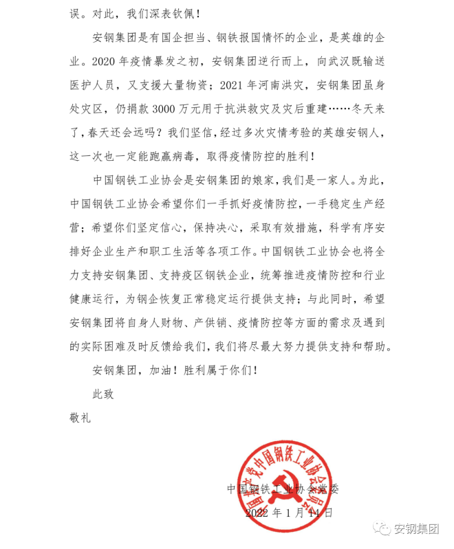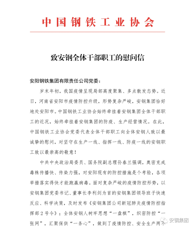 2022年1月14日,在安鋼全體干部職工齊心協力全面抗擊疫情的關鍵時期,中國鋼鐵工業協會尺素傳情,向安鋼及時送達《致安鋼全體干部職工的慰問信》,言辭親切、感情真摯,讀后令人倍感溫暖和振奮,增強了安鋼人戰勝疫情的強大決心和信心。