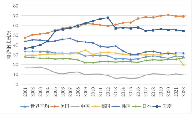 圖1 2001—2022年世界主要產(chǎn)鋼國(guó)電爐鋼產(chǎn)量占比的變化