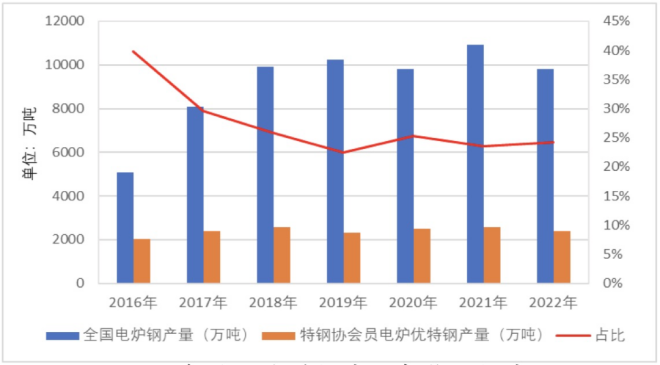 圖2 近年我國(guó)電爐鋼產(chǎn)量與優(yōu)特鋼產(chǎn)量