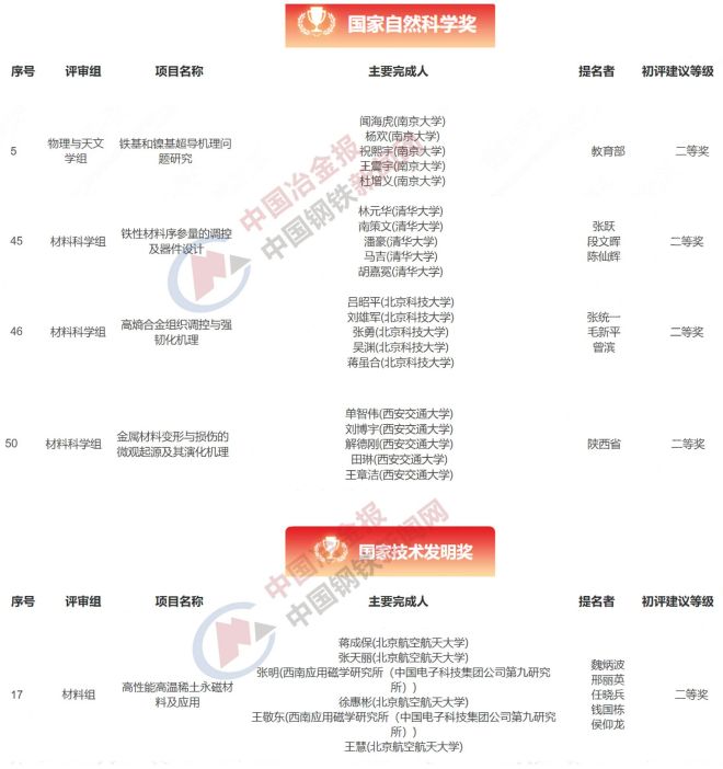 4月8日,科學技術部發布《國家科學技術獎勵工作辦公室公告第100號》,公告顯示2023年度國家科學技術獎初評工作已經結束。初評共通過國家自然科學獎通用項目59項、國家技術發明獎通用項目52項、國家科學技術進步獎通用項目132項,均在國家科技管理信息系統公共服務平臺(https://service.most.gov.cn/jl)予以公布。其中,涉及鋼鐵相關領域的國家自然科學獎項目共4項、國家技術發明獎1獎、國家科學技術進步獎項目7項!