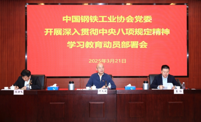 3月21日,中國鋼鐵工業協會黨委召開深入貫徹中央八項規定精神學習教育動員部署會。會議傳達了中央社會工作部全國性行業協會商會全面從嚴治黨暨警示教育會議精神,并對鋼協系統開展深入貫徹中央八項規定精神學習教育進行動員部署。