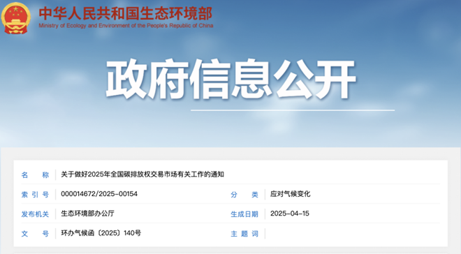4月15日,生態(tài)環(huán)境部發(fā)布《關(guān)于做好2025年全國碳排放權(quán)交易市場有關(guān)工作的通知》。