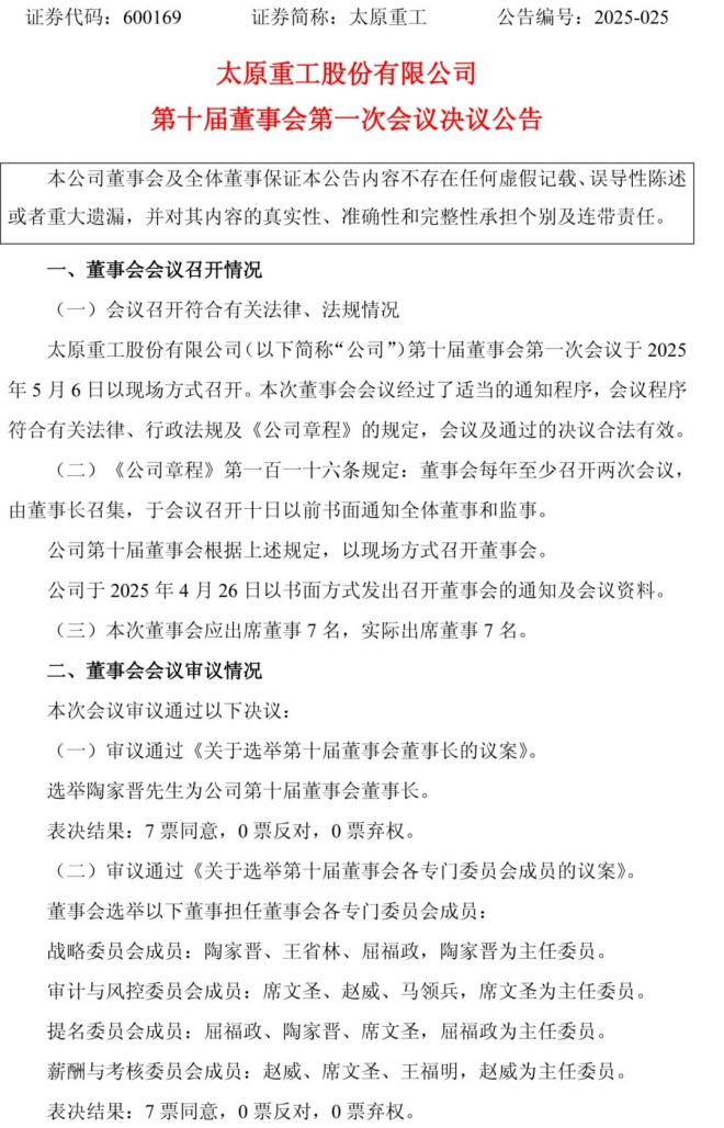 5月7日,太原重工發(fā)布公告稱,2025年5月6日,第十屆董事會第一次會議審議通過《關(guān)于選舉第十屆董事會董事長的議案》,選舉陶家晉先生為公司第十屆董事會董事長。