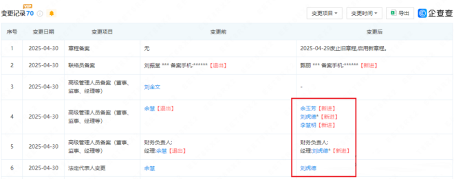 高級管理人員備案(董事、監(jiān)事、經(jīng)理等):劉金文退出,財務(wù)負(fù)責(zé)人、經(jīng)理余慧退出,新進(jìn)李慧明、余玉芳、劉虎德,劉虎德?lián)谓?jīng)理。